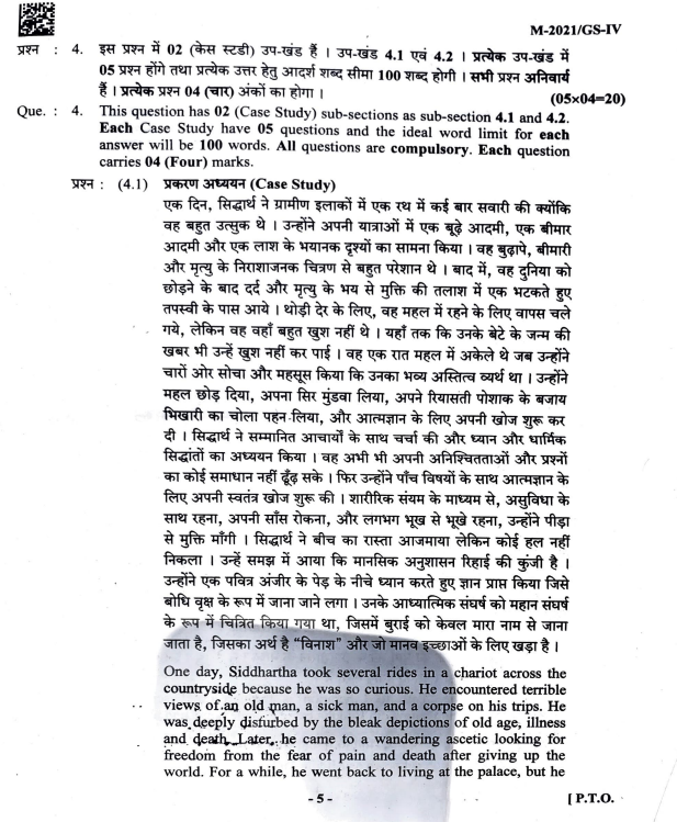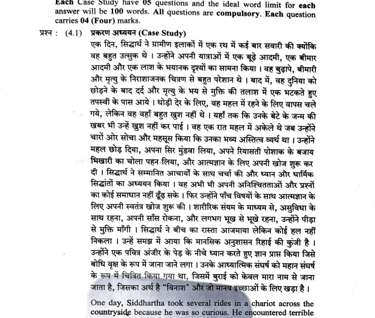 प्रश्न (4.1) प्रकरण अध्ययन (Case Study) एक दिन, सिद्धार्थ ने ग्रामीण इलाकों में एक रथ में कई बार सवारी की क्योंकि वह बहुत उत्सुक थे । उन्होंने अपनी यात्राओं में एक बूढ़े आदमी, एक बीमार आदमी और एक लाश के भयानक दृश्यों का सामना किया। वह बुढ़ापे, बीमारी और मृत्यु के निराशाजनक चित्रण से बहुत परेशान थे। बाद में, वह दुनिया को छोड़ने के बाद दर्द और मृत्यु के भय से मुक्ति की तलाश में एक भटकते हुए तपस्वी के पास आये। थोड़ी देर के लिए, वह महल में रहने के लिए वापस चले गये, लेकिन वह वहाँ बहुत खुश नहीं थे। यहाँ तक कि उनके बेटे के जन्म की खबर भी उन्हें खुश नहीं कर पाई। वह एक रात महल में अकेले थे जब उन्होंने चारों ओर सोचा और महसूस किया कि उनका भव्य अस्तित्व व्यर्थ था । उन्होंने महल छोड़ दिया, अपना सिर मुंडवा लिया, अपने रियासती पोशाक के बजाय भिखारी का चोला पहन लिया, और आत्मज्ञान के लिए अपनी खोज शुरू कर दी। सिद्धार्थ ने सम्मानित आचार्यों के साथ चर्चा की और ध्यान और धार्मिक सिद्धांतों का अध्ययन किया। वह अभी भी अपनी अनिश्चितताओं और प्रश्नों का कोई समाधान नहीं ढूंढ सके। फिर उन्होंने पाँच विषयों के साथ आत्मज्ञान के लिए अपनी स्वतंत्र खोज शुरू की। शारीरिक संयम के माध्यम से, असुविधा के साथ रहना, अपनी साँस रोकना, और लगभग भूख से भूखे रहना, उन्होंने पीड़ा से मुक्ति माँगी । सिद्धार्थ ने बीच का रास्ता आजमाया लेकिन कोई हल नहीं निकला। उन्हें समझ में आया कि मानसिक अनुशासन रिहाई की कुंजी है। उन्होंने एक पवित्र अंजीर के पेड़ के नीचे ध्यान करते हुए ज्ञान प्राप्त किया जिसे बोधि वृक्ष के रूप में जाना जाने लगा। उनके आध्यात्मिक संघर्ष को महान संघर्ष के रूप में चित्रित किया गया था, जिसमें बुराई को केवल मारा नाम से जाना जाता है, जिसका अर्थ है "विनाश" और जो मानव इच्छाओं के लिए खड़ा है।